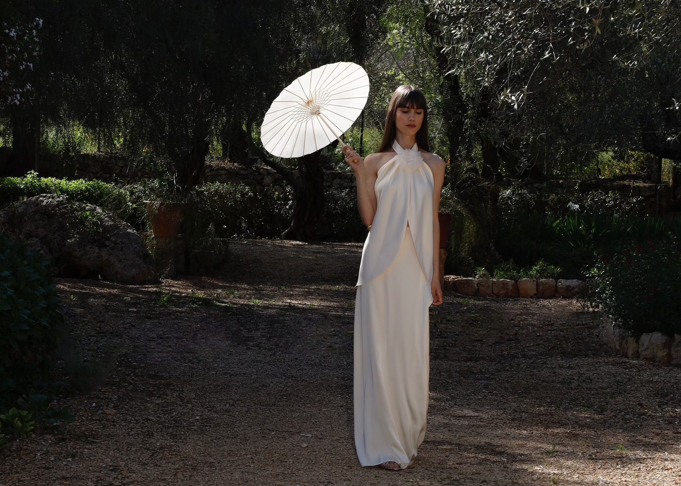 The Iris dress is a black sleeveless maxi with a clean, straight silhouette. It features a bold side cutout with a white rose adding contrast and dimension, with soft petals that cascade delicately. Simple from the front, with an unexpected detail at the side — perfect for evening events.